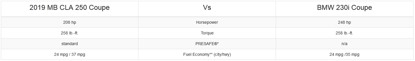 Right away, you can see that the 2019 Mercedes-Benz CLA 250 Coupe doesn’t have as much horsepower as the BMW 230i. However, if you look at the torque of each vehicle, you’ll notice that the both have 258 lb.-ft. of torque. So, while the CLA 250 is a bit less powerful, it has the same kick to it as the BMW 230i.
