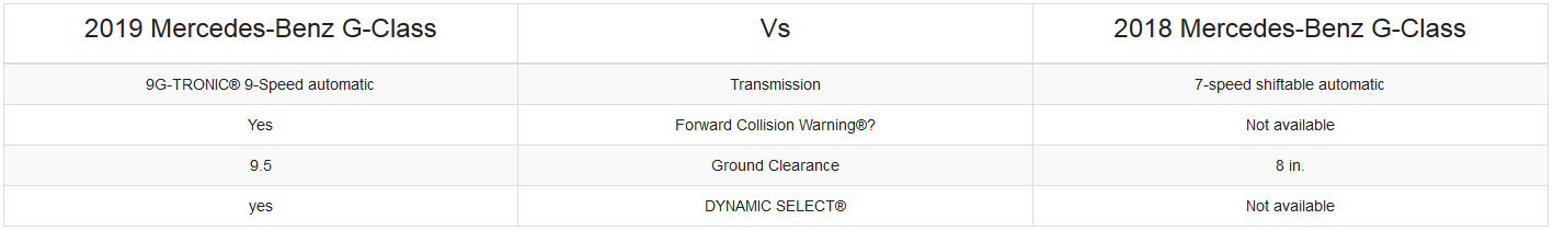 The 9G-TRONIC® 9-speed automatic transmission is an exciting addition, especially as this isn’t the only new thing on the 2019 Mercedes-Benz G-Class. You’ll also have an all-new independent suspension system. You can also get driver-assist technologies in the 2019 Mercedes-Benz G-Class that weren’t even available on the 2018 version. The Forward-Collision Warning® system is among these safety features, and it works to help make driving this G-Class SUV a safer experience for driver and passengers alike.